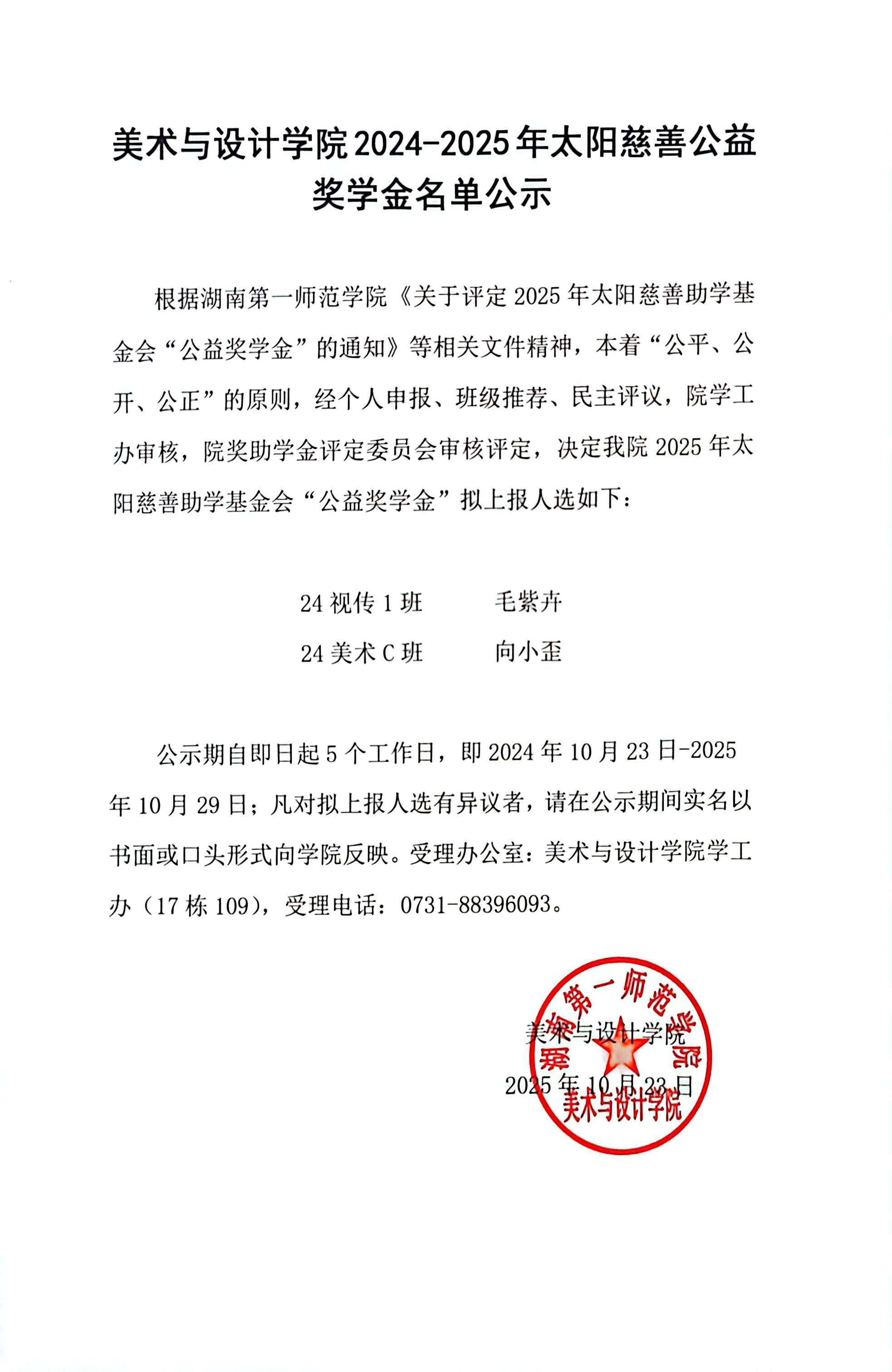 《关于评定2025年太阳慈善助学基金会“公益奖学金”的通知》等相关文件精神,本着“公平、公开、公正”的原则,经个人申报、班级推荐、民主评议,院学工办审核,院奖助学金评定委员会审核评定,决定168足球比分